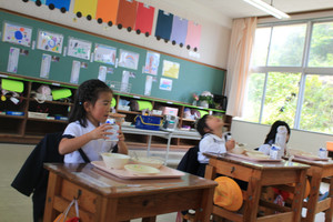 1・2年生の給食のようすを見に行きました。ほとんどの子が好き嫌いせずに,もりもり?食べていました。たくさん食べて大きくなーれ!!
